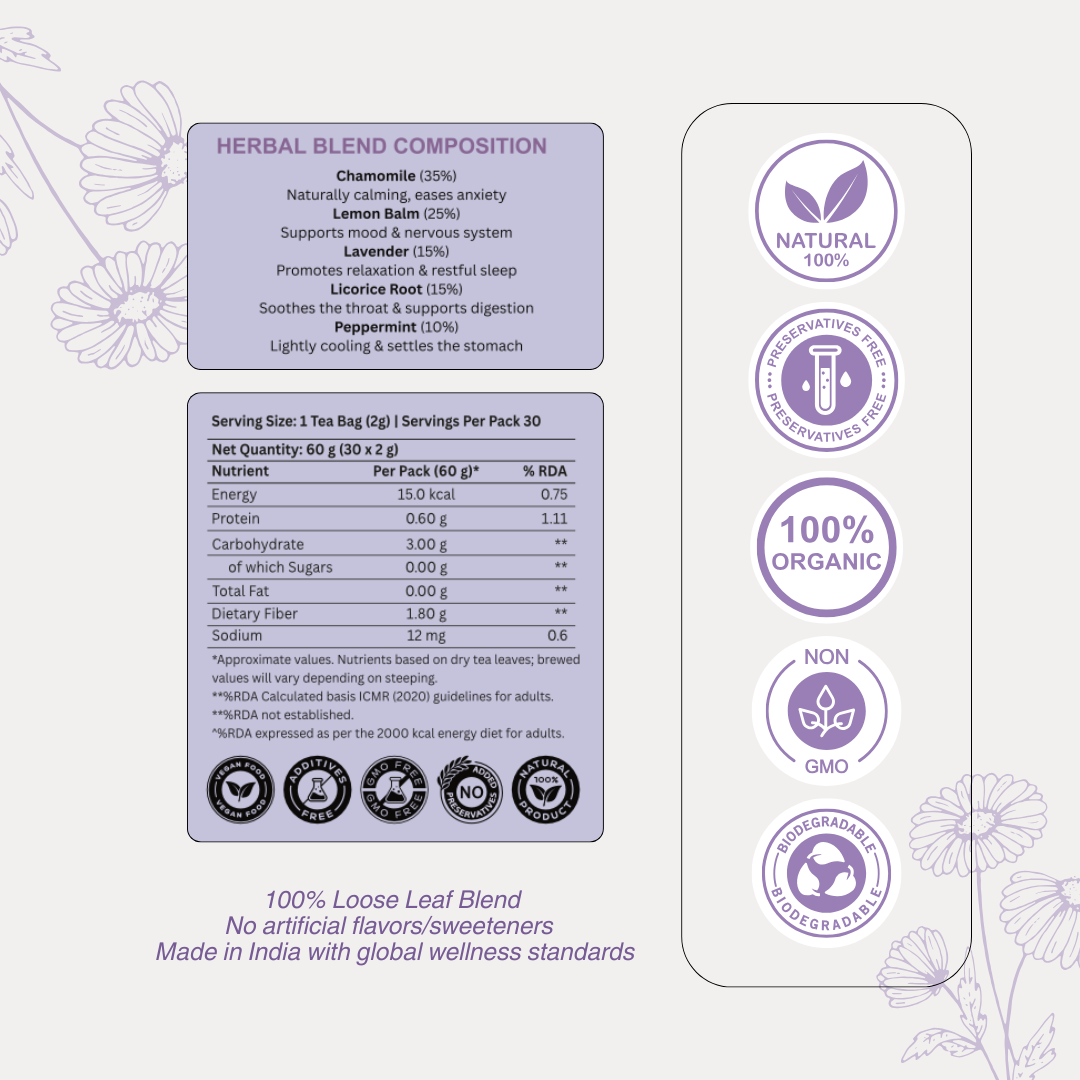 It’s a calming, herbal blend designed to promote relaxation, reduce stress, and prepare your body and mind for deep, natural sleep—without any caffeine or synthetic sleep aids.